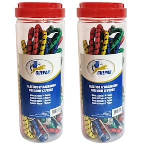 Kit 24 Elásticos para Bagageiro Carga Moto Bike Gancho Metal O elástico para bagageiro é ideal para prender objetos em motos, carros, bicicletas, carrinhos de mão entre outros. Possui corpo em borracha, polipropileno e aço e possui gancho nas pontas. - Marca: Guepar - Referência: 861-1369-2X - Indicado para diversas formas de uso como amarrar carga, bagagens, entre outros - 8 Elásticos 30cm x 6mm - 8 Elásticos 45cm x 6mm - 4 Elásticos 60cm x 6mm - 4 Elásticos 90cm x 6mm - Indispensável para amarração e segurança no transporte de cargas com bicicletas, carrinhos de mão, moto, pick ups, caminhonetes, bagageiro de carros, como camping, pesca, motociclismo, paraquedismo, asa-delta, etc... - Fabricada em borracha trançada de alta resistência revestido com fibra - Ganchos de aço carbono com acabamento em zinco - Pontas dos ganchos revestidos com borracha para não danificar os veículos - O Cabo de Elástico Extensor é fácil de usar e ajustar, pois tem ganchos em cada ponta que ajudam a prender os objetos de forma segura e prática. - : 90 dias