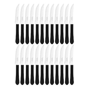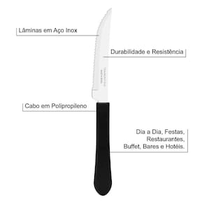conteúdo do kit: 24 - facas de mesa churrasco tramontina leme inox cabo preto. Características do produto: lâmina: em aço inox; cabo: polipropileno preto. Dimensões produto compr. X larg. X alt. : comprimento: 20,2 cm largura: 0,9 cm altura: 1,8 cm