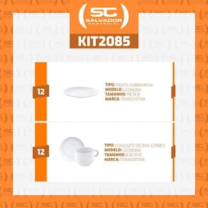 O kit é composto por 12 pratos de sobremesa Leonora em porcelana branca, com 19 cm de diâmetro cada, e 12 conjuntos de xícara de chá Paola em porcelana branca, com capacidade de 240ml cada.
