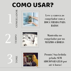 Modo de Uso Simples: Coloque a caneca no freezer sempre com a boca para baixo. Deixe lá por no máximo 4 horas.
