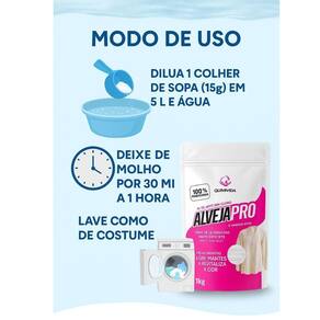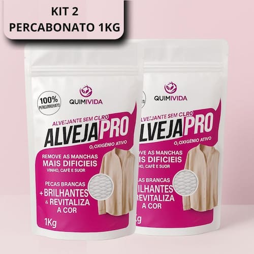 Kit com 2 AlvejaPro Quimivida 1kg Cada Brilho e Renovação das Roupas O que você vai receber: 2 unidades de AlvejaPro Quimivida 1kg Descrição do Produto: O AlvejaPro Quimivida é um reforçador de lavagem com ação do oxigênio ativo, desenvolvido para ajudar na remoção de manchas do dia a dia como café, vinho, suor e encardidos. Sua fórmula à base de percarbonato de sódio cuida dos tecidos, mantendo as roupas mais claras, coloridas e com aparência renovada, sem uso de cloro. Benefícios: Fórmula com oxigênio ativo que ajuda na remoção de manchas. Realça o branco e mantém cores mais vivas. Indicado para roupas de cama, mesa, banho e uso diário. Pode ser em máquinas de lavar ou em tanques. Produto versátil: auxilia também em lavagens de tecidos delicados. Não agride as fibras dos tecidos. Embalagem econômica de 1kg cada. Modo de Uso: Pré-lavagem: dissolva cerca de 15g em 1 litro de água morna e deixe a peça de molho por até 30 minutos. Lavagem em máquina: adicione 1 a 2 colheres de sopa junto com o sabão de sua preferência. Para melhores resultados, utilize água morna. Manchas localizadas: prepare uma pastinha com o produto e água, aplique sobre a mancha e aguarde alguns minutos antes de lavar. Observações Importantes: Recomendado sempre testar em uma pequena área da peça antes do uso. Armazenar em local seco, fresco e ao abrigo da luz. Marca: Não Informado