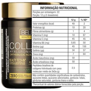 Colágeno peptídico, polidextrose, acerola em pó, hialuronato, ácido ortosilícico estabilizado em cloreto de colina, aspartato de zinco quelato, ácido ascórbico, acetato de d-alfa-tocoferol, selenometionina, cloridrato de piridoxina, biotina, acidulante ácido cítrico, aromatizantes, antiumectante dióxido de silício, corante urucum e edulcorante glicosídeos de esteviol. Não contém lactose, não contém glúten.