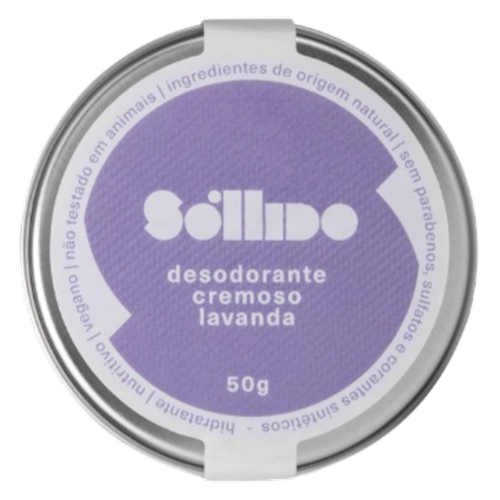 A fórmula do Desodorante Cremoso Lavanda Sóllido tem um alto poder de hidratação, com óleos naturais e orgânicos que restauram a barreira protetora da derme, combatem inflamações e equilibram o suor produzido pelas glândulas sebáceas. Não contém sulfatos, parabenos, silicones, fragrâncias sintéticas e plásticos, além de ser cruelty-free.