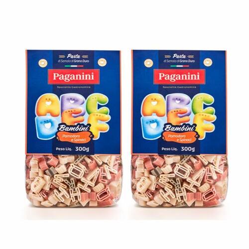 O macarrão bambini letrinhas tricolore paganini é elaborada com sêmola de grano duro, tomate e espinafre desidratados, resultando em massa tricolore branca, verde e vermelha .