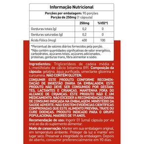 Ingredientes: triglicerídeos de cadeia média e l-metilfolato de cálcio vitamina b9 . Composição da cápsula: gelatina, água, purificada, umectante glicerina e curcumina. Não contém glúten.
