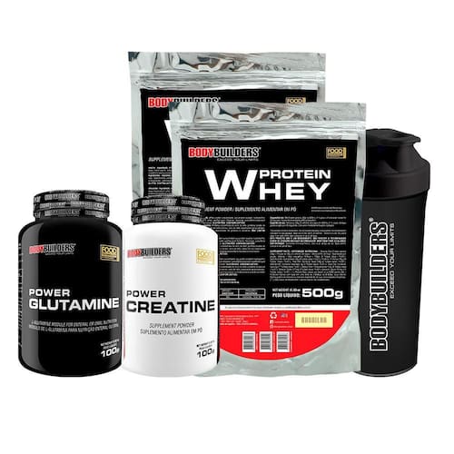 Kit 2x Whey Protein 500g baunilha + Power Creatina 100g + Power Glutamina 100g + 1 Coqueteleira - BodyBuildersO kit 2x Whey Protein BAU 500g + 1 POWER Creatina 100g + 1 POWER Glutamina 100g + 1 Coqueteleira - BodyBuilders é composto por produtos que são referência no mercado, além de oferecer um ótimo custo benefício. Whey Protein é a proteína extraída do soro do leite, utilizada para potencializar o desempenho atlético e aumentar a força. A Whey Protein é uma fonte de proteína que pode melhorar o conteúdo de nutrientes da dieta, além de gerar efeitos positivos no sistema imunológico. Com preparo rápido, fácil e prático, está disponível em três deliciosas opções de sabores: Chocolate, Baunilha e Morango. POWER Creatina é um produto ainda mais concentrado. A Creatina é responsável pela produção de energia em células musculares, fornecendo muito mais disposição durante os treinos. A Creatina também ajuda a suprir as necessidades nutricionais do corpo humano, contribuindo com o ganho de massa muscular e auxiliando na recuperação dos músculos. POWER Glutamine é um produto ainda mais concentrado. A Glutamina é indispensável na dieta de quem pratica treinos longos, intensos e regulares e sua suplementação é responsável pela construção de proteínas no corpo humano. Desta forma, a Glutamina ajuda a melhorar o seu desempenho e performance durante os exercícios do dia a dia, além de auxiliar na recuperação e manutenção dos músculos. Imagem meramente ilustrativa Evite automedicação, consulte sempre um especialista. O rótulo e a embalagem podem variar de acordo com o lote.