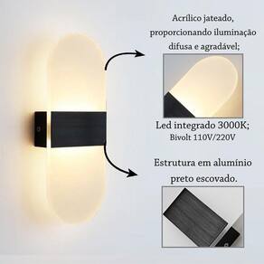 Kit 3 Arandela Cabeceira Acrilico Jateado Led Integrado Lup91 Essa peça tem o poder de deixar qualquer ambiente mais belo e refinado. Imagine em sua casa...Arandela interna, com seu design moderno deixará seu ambiente com um toque a mais de requinte e estilo.Neste kit contem 03 arandelas lup91. Descrição:- material: alumínio e acrílico jateado- cor: preto- pintura: escovado- dimensões: Altura: 27 cm Comprimento: 10 cm Largura: 4 cm- led integrado 3000k incluso- tensão: bivolt- garantia: 1 anosAtenção: a base da arandela não cobre a caixinha de luz 4x2Produto destinado a projetos em que não são deixados a caixinha 4x2Como espera para fixar a arandela. Led integrado, não necessita de lâmpada.