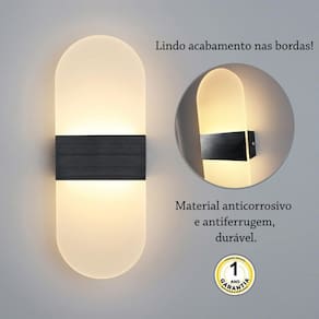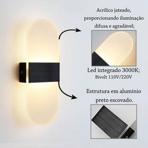 Kit 3 Arandela Cabeceira Acrilico Jateado Led Integrado Lup91 Essa peça tem o poder de deixar qualquer ambiente mais belo e refinado. Imagine em sua casa... Arandela interna, com seu design moderno deixará seu ambiente com um toque a mais de requinte e estilo. Neste kit contem 03 arandelas lup91. Descrição: - material: alumínio e acrílico jateado - cor: preto - pintura: escovado - dimensões: Altura: 27 cm Comprimento: 10 cm Largura: 4 cm - led integrado 3000k incluso - tensão: bivolt - : 1 anos Atenção: a base da arandela não cobre a caixinha de luz 4x2 Produto destinado a projetos em que não são deixados a caixinha 4x2 Como espera para fixar a arandela. Led integrado, não necessita de lâmpada. Ean: 7891072785796