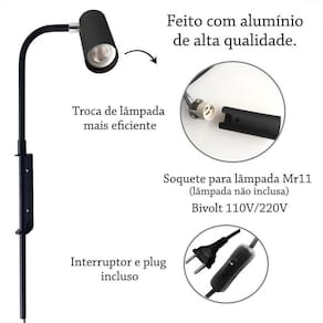 A nossa arandela articulada Lup87 é a escolha perfeita para quem procura iluminação direta e focada, ela permite direcionar a luz para diferentes locais, destacando pontos específicos na sua decoração.Neste kit contem 3 arandelas Lup87.Descrição: Acompanha interruptor e plug. Para tomada.Material: AlumínioCor da estrutura: PretoCor da cúpula: PretoMedidas:-comprimento da cúpula: 9 cm-diâmetro da cúpula: 3,8 -comprimento da base que fixa na parede: 11 cm-profundidade da base: 3 cm-comprimento do fio: 161 cm-comprimento total da arandela: 41 cm-tensão: bivolt 110V 220V-soquete: GU10Lâmpada não inclusa.