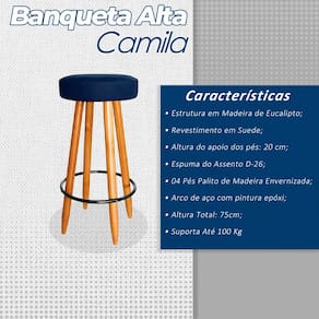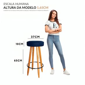 Características do Produto: - Base do assento e fundo Mdf e Mdp de 15MM; - Altura para apoio dos pés: 20 cm; - Altura do Assento: 10 cm; - Parte inferior acabamento em TNT preto; - Estrutura em madeira de eucalipto; - Arco em aço, com pintura especial epóxi; - Suporta uma pessoa até 100 kg; - Garantia 3 meses por nós fabricantes; - Formato Redondo; - Espuma do Assento D-23; - 4 Pés Palito Retrô; - 4 Chapas de Aço Galvanizado para fixação dos pés; Dimensões do produto montado: - Altura: 75 cm; - Largura: 37 cm; - Comprimento: 37 cm; Observações importantes: Para assegurar que sua banqueta mantenha sua durabilidade e beleza ao longo do tempo, siga estas recomendações: 1 - Limpeza: Use pano úmido com sabão neutro, evitando abrasivos. 2 - Proteção Solar: Evite sol direto para prevenir desgaste. 3 - Umidade: Seque imediatamente em caso de derrames. 4 - Uso Adequado: Respeite a capacidade de peso indicada e não faça movimentos perigosos em cima da banqueta. 5 - Manutenção: Inspecione periodicamente e limpe conforme instruções acima. 6 - Armazenamento: Local limpo e seco, protegido de poeira e umidade, não expor ao sol e chuva.