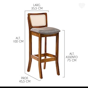 INFORMAÇÕES TÉCNICAS: Altura Total: 100 cm Altura Chão até Assento: 75 cm Altura Encosto: 29 cm Largura Total: 35,5 cm Largura do Assento: 41 cm Profundidade Total: 45,5 cm Profundidade Assento: 35 cm Peso: 7 kg