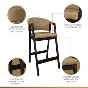 CARACTERÍSTICAS TÉCNICAS: - Produzido em Madeira Maciça; - Acabamento Verniz na Cor Capuccino; - Assento com Espuma D26; - Encosto com Espuma D23; - Revestido em Tecido Material Sintético na Cor Bege.