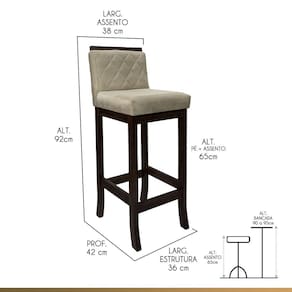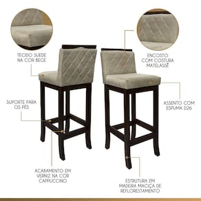 Apresentamos a banqueta Nice, feita com madeira maciça de reflorestamento e acabamento em verniz. Seu assento preenchido com espuma D26 e encosto com espuma D23 garantem conforto duradouro. O encanto adicional vem da costura matelassê no encosto, enquanto o revestimento em suede adiciona uma sensação de luxo. Adapta-se perfeitamente a qualquer espaço, adicionando elegância e conforto instantaneamente. CARACTERÍTICAS TÉCNICAS: - Produzido em Madeira Maciça de Reflorestamento; - Acabamento em Verniz na cor Capuccino; - Assento Preenchido com Espuma D26; - Encosto Preenchido com Espuma D23; - Encosto com Costura Matelassê; - Revestimento em Suede na cor Bege.   *Indicada para Bancadas/Mesas com Alt. 90/95 cm. *PRODUTO ENVIADO MONTADO.   INFORMAÇÕES TÉCNICAS: Altura Total: 92 cm Altura até Assento: 65 cm Altura até Travessa: 13 cm Altura Encosto: 35 cm Largura Assento: 38 cm Largura Estrutura: 36 cm Profundidade Total: 42 cm Profundidade Assento: 41 cm Peso: 7 kg   *Kit Composto por 3 Banquetas Nice. INFORMAÇÕES ADICIONAIS:ATENÇÃO: Móvel produzido em madeira maciça natural podendo ocorrer mudança no tom da madeira conforme o produto;*Conferir se o produto está de acordo com o que comprou, produto danificado não será aceito troca;**As imagens ambientadas são meramente ilustrativas e podem apresentar itens que não compõe o produto. As cores do produto podem variar de acordo com o monitor, a iluminação do ambiente ou sua percepção visual;***Limpeza deve ser feita com pano macio e seco ou levemente umedecido com água e sabão neutro. Não devem ser utilizados abrasivos como palha de aço e objetos cortantes;Garantia para defeitos de fabricação conforme Código de Defesa do Consumidor.