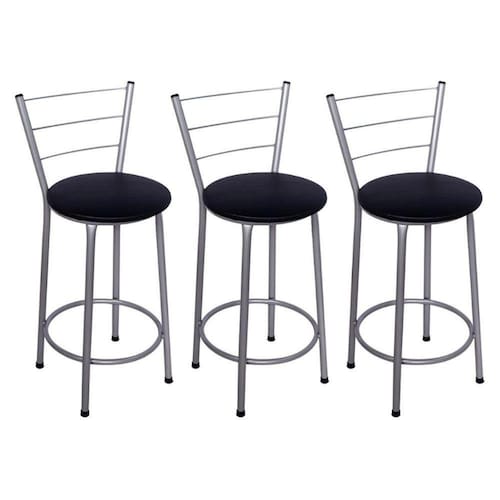Kit 3 Banquetas Médias Prata com Encosto Assento Preto