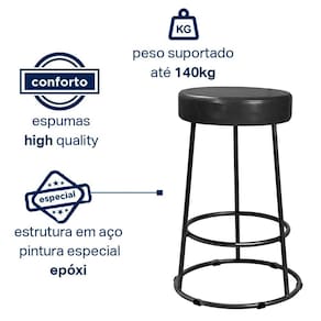 Conforto, resistência e estilo para compor seu ambiente com sofisticação. A Banqueta Roma possui assento revestido em couríssimo, espuma D-28 de alta qualidade e estrutura em madeira de reflorestamento tratada contra fungos e mofo. Sua base e encosto em aço com pintura epóxi garantem durabilidade e visual moderno. Com estrutura reforçada e montagem com grampos galvanizados, suporta até 140kg, ideal para cozinhas, áreas gourmet ou bancadas integradas.