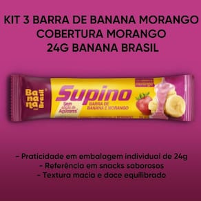 Kit 3 Barra de Banana com Morango e Cobertura de Morango 24g - Banana Brasil Doce na medida certa, com sabor irresistível de morango A Barra de Banana com Morango e Cobertura de Morango da Banana Brasil é A escolha perfeita para quem aprecia uma combinação deliciosa e prática. Produzida com pedaços de banana e morango cuidadosamente selecionados, Recebe uma cobertura sabor morango que deixa cada mordida ainda mais Marcante. Compacta e leve, é ideal para levar na bolsa, lancheira ou mochila, Proporcionando uma experiência saborosa em qualquer momento do dia.