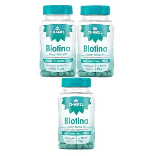 Kit 3 Biotina 30mcg c/60 Cápsulas Chamel Kit 3 Biotina 30mcg c/60 Cápsulas Chamel A Biotina A BIOTINA, também chamada de de vitamina H ou vitamina B7 , é uma vitamina essencial para o organismo e apresenta funções específicas que reduzem o risco de doenças e auxiliam no funcionamento do organismo, além é claro de contribuir para uma alimentação mais balanceada. Um organismo nutricionalmente saudável precisa consumir diariamente micronutrientes como vitaminas e minerais. A quantidade ou IDR Ingestão Diária Recomendada pode variar conforme o grupo populacional dividido por idades ou condição especial como gestantes, mães que amamentam ou praticantes de atividade física. Para vitamina BIOTINA na Tabela 1, temos a ingestão diária recomendada para cada grupo específico