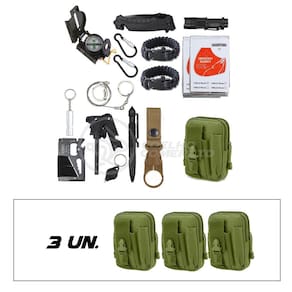- Materiais: Tecido/Pano (Bolsa), Aço (Faca, cartão multifuncional, caneta e etc.), Plástico (Lanterna), Alumínio (Manta Térmica).
