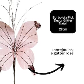 Encante sua decoração de Natal com a delicadeza e o brilho da Borboleta Pick Decorativa com Glitter Rosê. Com design elegante e acabamento sofisticado, ela é perfeita para compor árvores de Natal, guirlandas, arranjos ou centros de mesa, trazendo um toque de leveza e charme festivo ao ambiente.