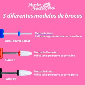 Características: -Flame F: Broca de gramatura de corte fino, é ideal para modelar, nivelar e esculpir as unhas artificiais; -Small Barrel Ball M: Broca de gramatura de corte mediano é indicada para realizar pequenos cortes e acabamentos nas proximidades das cutículas das unhas; -Bullet XC: Broca de gramatura de corte grosso, é a broca perfeita para remoção de resíduos das unhas artificiais, assim como pequenos cortes e nivelamento da superfície das unhas.