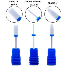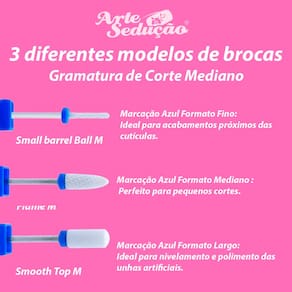 Características: -Small Barrel Ball M: Broca de gramatura de corte mediano é indicada para realizar pequenos cortes e acabamentos nas proximidades das cutículas das unhas; -Flame M: Broca de gramatura de corte mediano, é ideal para modelar, nivelar e esculpir as unhas artificiais; -Smooth Top M: Broca de gramatura de corte mediano, é a broca perfeita para pequenos cortes e nivelamento da superfície das unhas.