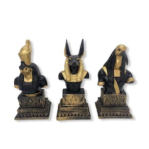 Kit contendo 3 bustos dos deuses egípcios Anubis, Horus e Thot de 15 cm de altura cada escultura. Além de servir como decoração, essa linda escultura em resina de alta qualidade, pintura artesanal e acabamento rico em detalhes pode ser um ótimo presente para homenagear pessoas especiais.