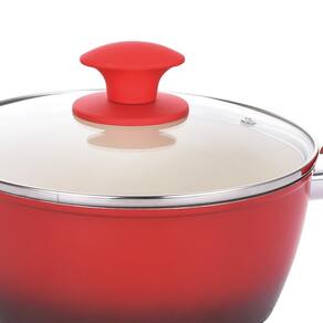 - Altura: 9cm - Altura com Tampa: 15cm - Diâmetro: 20cm - Comprimento com cabo: 34cm - Capacidade: 2,4l - Espessura: 3,7 mm - Material: Alumínio com revestimento cerâmico - Marca: Class Home - Cor: Vermelho - Referência: 2079 - Conteúdo: 3 Caçarolas