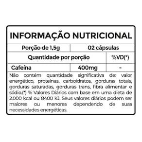 Ingredientes: Cafeína anidra, óleo de soja e emulsificante lecitina de soja. Composição da cápsula: gelatina, água purificada, umectante glicerina, corante vermelho ponceau, azul brilhante, amarelo crepúsculo e dióxido de titânio. Não contém glúten.