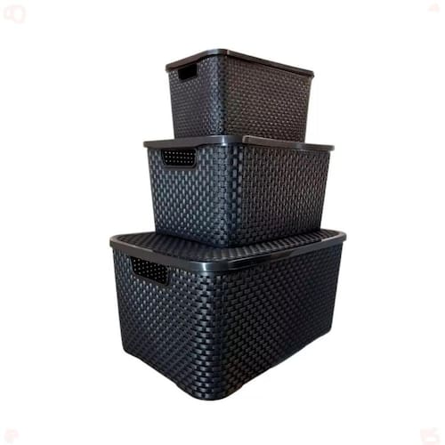 Kit 3 Caixas Organizadoras Rattan Preta Pequena Média Grande