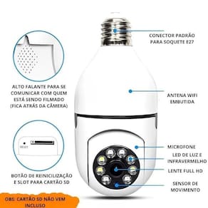 Kit 3 Camera De Seguranca Wifi Wireless Ip Sem Fio Giratória 360 Camera Lâmpada Wifi Ip Segurança Panoramica Giratoria Esta câmera dome é perfeita para combater vandalismo e situações adversas graças à sua excelência em durabilidade. Sua cúpula é fechada em uma caixa resistente, o que ajudará a mantê-la protegida contra solavancos e empurrões. Tem uma resolução Full HD pela qual você será capaz de gravar com a melhor qualidade e, assim, ter uma vigilância clara e precisa sobre seus espaços. Graças à sua função de visão noturna incluída, você não precisará mais se preocupar com a iluminação dos seus espaços Apenas uma câmera consegue cobrir uma área bem maior do que uma câmera comum. Você consegue girar a imagem através do celular e controlar o zoom. É possível acender a luz remotamente através da internet, conversar com quem está no local e você ouve tudo o que está sendo falado onde a câmera esta instalada. Sistema extremamente simples de instalar, basta colocar em um bocal de lâmpada comum, tem o tamanho e formato de uma lâmpada de led comum, discreto. Conecta-se a sua rede wifi e a partir daí você pode visualizar e interagir de qualquer lugar do mundo através do seu celular ou tablet. Se alguém entra no ambiente você receberá uma mensagem em seu telefone e poderá visualizar/interagir com a pessoa. CARACTERÍSTICAS Auto Tracking - Rastreamento Automático Monitoramento 360o - inclinação automática ou por controle remoto Sistema Night Vision - Visão Noturna e Diurna com Infra Vermelho Alarme de movimentação - Dispara o alarme no seu celular ao detectar movimentos suspeitos Sistema de áudio - Microfone com gravador de áudio detecta todos os sons do ambiente Alta Durabilidade - Câmera tem o grau de proteção IP44 Proteção contra respingos de água. Não orientamos a instalação em áreas totalmente descobertas Acesso Remoto - Movimentação manual via controle remoto através do seu celular CARACTERISTICAS: Compatível com o APP Yoosee Compativel apenas wifi 2.4ghz, não é compatível com 5Ghz Conexão móvel 1080p Full HD - 2MP Controle ptz: 355 graus horizontal e 100 graus vertical Detector de movimento: quando o dispositivo detectar movimento de uma pessoa, automaticamente ela seguirá o movimento do alvo. Armazenamento por Cartão TF/microSD: Máximo de 128GB Visão noturna colorida com LEDs brancos pode ser desativada Áudio bidirecional: possibilitando a conversa entre o celular e a câmera Grau de proteção: IP44 Consumo de energia: 3w Compressão de vídeo: Smart H.264 Lente: 3.6mm Dimensões: 3x6,5x3cm Peso: 350gr Cada ITENS INCLUSOS: 3 Câmera Lâmpada 3D 3 Suporte para Fixação E27 3 Manual de instruções 3 Kit Parafusos Homologação Anatel: 112572013224 Marca: Não Informado