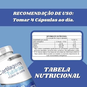 Kit 3 cartilagem de tubarão + cálcio de ostra de 800mg Sabor: sem sabor Somos l&m cápsulas trabalhamos com produtos de alta qualidade Produto e com . Kit com 3 potes de cartilagem com calcio de ostra 180 cápsulas totais Marca: 4elementos Descrição: Este produto é um suplemento, não é um Como tomar Recomendação de uso: A recomendação do fabricante é tomar 4 cápsulas ao dia. Ou conforme indicação do médico ou nutricionista. Ideal para uso de 1 mês e meio. 45 dias Observação: Como qualquer outro produto natural os resultados não e de um dia para outro o uso de cartilagem de tubarão com cálcio de ostra 800mg 60 cápsulas é um tratamento natural e seu efeito inicia após alguns dias de uso. Composição: Cartilagem de tubarão e concha de ostra em pó. Contra indicação: Pessoas com alergias a algum componente da formula ou problemas graves de saúde. Crianças, gestantes, idosos e portadores de qualquer enfermidade devem consultar o médico e/ou nutricionista. Este produto não substitui uma alimentação equilibrada e seu consumo deve ser orientado por um nutricionista e/ou médico. Anvisa: registro isento conforme resolução rdc 27 do 06 de agosto de 2010 anexo i. Qualidade e confiança garantida Sabemos que esse mercado é bem competitivo, que tem produtos com todos os preços para todo tipo de público. Porém nossa loja preza muito pela qualidade, então só trabalhamos com as fabricas que possuem as melhores matérias primas e que seguem 100% a idr da anvisa. Dessa forma quem faz o uso dos nossos produtos sempre procura nossa marca novamente, pois gosta dos resultados. Envios: Despachamos no máximo em 24 horas úteis na grande maioria bem antes disso . Dúvidas Marca: Não Informado