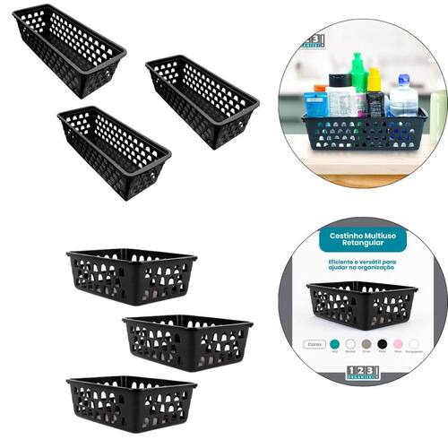 Kit 3 Cesto Multiuso Comprido Retangular e 3 Cesto médio Cesto Multiuso Comprido Retangular Preto 123 Organizei Os Cestos Multiuso 123Organizei, são muito charmosos e discretos. Podem ser em armários, gavetas, guarda roupas e até mesmo em banheiro. MEDIDAS: Altura: 8,00cm Largura: 11,00cm Comprimento: 28,00cm 123organizei ------------------------------------------------------------ CESTO PRETO Médio 123ORGANIZEI Cor PRETO Medidas 20x15,5x6,5Cm Material PLástico Marca 123Organizei Marca: Não Informado