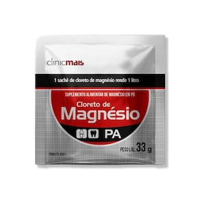 Sobre o produto O Cloreto de Magnésio P.A Ifal é um repositor de magnésio que atua na prevenção e tratamento da deficiência de magnésio no organismo. Benefícios Aumento das funções cerebrais, atuando diretamente na melhora o aprendizado e memória, fortalecimento dos ossos; Prevenção e tratamento contra enxaquecas e dores de cabeça; Diminuição do risco de hipertensão e doenças cardiovasculares. Modo de usar Dissolva 33 gramas o pacote todo de cloreto de magnésio p.A. Em 1 litro de água fria filtrada ou fervida e mexa bem. Guarde em um recipiente de vidro com tampa na geladeira. Consumir a solução em até 30 dias. Sugere-se a ingestão de 3 colheres de sopa 45ml ao dia. Ingredientes Cloreto de magnésio P.A. Hexahidratado. Marca: Não Informado
