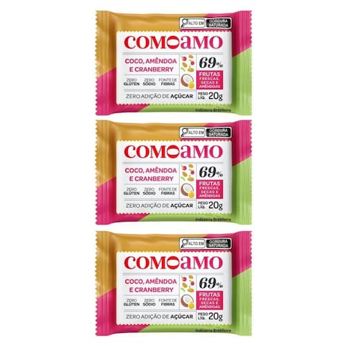 Kit 3 Coco, Amêndoas e Cranberry Zero 20g - ComoAmo - Grupo Rocha Saúde Textura crocante, sabor equilibrado e ingredientes selecionados para um lanche funcional e delicioso O Coco, Amêndoas e Cranberry Zero 20g - ComoAmo é a união perfeita entre o sabor delicado do coco, a crocância das amêndoas e o toque levemente ácido e frutado do cranberry. Com zero adição de açúcar, é uma opção prática e saborosa para quem busca um doce equilibrado e pronto para qualquer momento do dia. Ideal para acompanhar cafés, para levar na bolsa ou saborear como um mimo entre refeições. Diferenciais do Produto Combinação equilibrada de coco, amêndoas e cranberry Zero adição de açúcar Textura firme com crocância natural Embalagem prática de 20g Sem glúten e sem lactose Sugestões de Consumo Como lanche rápido entre as refeições Para acompanhar bebidas quentes Em momentos de pausa no trabalho ou estudos Ótimo para levar na lancheira, bolsa ou mochila Destaques do Produto Sabor marcante e sofisticado Ingredientes naturais e cuidadosamente combinados Pronto para consumo imediato Leve, prático e funcional Informações do Produto Produto: Coco, Amêndoas e Cranberry Zero Marca: ComoAmo Peso: 20g Não contém: Glúten e lactose Marca: Não Informado Ean: 7898966971181