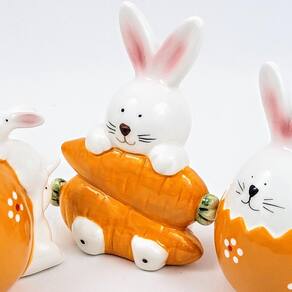 Design Sofisticado e Charmoso: Cada peça é delicadamente esculpida, com detalhes minuciosos que refletem a beleza da tradição e da arte da Páscoa. A combinação de coelhos com ovos e cenouras traz um visual alegre e refinado para sua decoração.