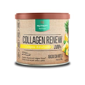 Kit 3 collagen renew colágeno hidrolisado abacaxi nutrify 300g Benefícios: fortalecimento da pele, unhas e cabelos. A firmeza e a sustentação de nossa pele estão diretamente relacionadas à produção de colágeno pelo organismo, que diminui progressivamente ao longo dos anos, ocasionando flacidez e outros sinais de envelhecimento. À base de colágeno hidrolisado, a fórmula de collagen renew nutrify também 2,5 g de peptídeos bioativos de colágeno verisol em cada porção, ajudando a recuperar a firmeza dos tecidos, melhorando sua aparência. Collagen renew nutrify é isento de açúcar, lactose, glúten, corantes e adoçantes artificiais, e conta com adição de vitaminas e minerais antioxidantes, que favorecem a absorção dos peptídeos e promovem o fortalecimento de unhas e cabelos. Nutrify valoriza a origem de cada ingrediente, respeita a integridade de suas fontes naturais e dos envolvidos em sua produção. É assim que criamos produtos saudáveis e saborosos, que fazem bem para as pessoas e para o planeta. Acreditamos que nutrir corpo e mente de modo saudável nos torna capazes de alimentar o mundo com atitudes positivas. Ingredientes: colágeno hidrolisado, colágeno hidrolisado bioativo verisol , mix de vitaminas e minerais vitamina c ácido ascórbico , vitamina e dl alfa-acetato de tocoferol , zinco sulfato de zinco mono-hidratado , vitamina a acetato de retinol , cromo picolinato de cromo , selênio selenito de sódio , vitamina h biotina e vitamina d colecalciferol , acidulante ácido cítrico, aromatizante e edulcorante estévia. Não contém glúten. Contém aromatizante sintético idêntico ao natural. Este produto não é um . Não exceder a recomendação diária de consumo indicada na embalagem. Mantenha fora do alcance de crianças. Este produto é recomendado para adultos a partir de 19 anos. Apresentação: embalagem disponível: lata contendo suplemento em pó. Sabor abacaxi com hortelã. Peso líquido: 300 g produto classificado como: suplemento alimentar de proteína, vitaminas e minerais em pó sabor de abacaxi com hortelã.