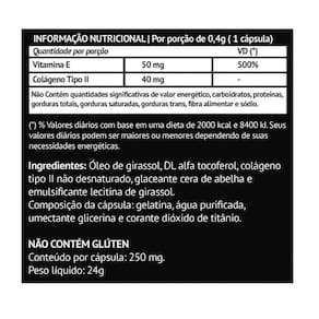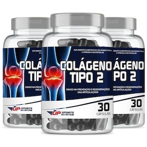 Kit 3 Colágeno Tipo 2 40Mg Com 30 CápsulasColágeno tipo 2 não desnaturado, com as mesmas propriedades do UC-2.Colágeno do tipo II, não-desnaturado, derivado da cartilagem de frango. É fabricado através de um processo de produção patenteado, não-enzimático, à baixas temperaturas, o que garante a obtenção de um colágeno puro, sem alteração molecular, com atividade biológica inalterada.Contribui significativamente para a melhora da resistência estrutural das articulações e fortalecimento das fibras musculares, proporcionando maior mobilidade e flexibilidade.IndicaçõesIndicado na prevenção de doenças osteoarticulares como artrose, osteoartrose, artrite, osteoartrite, artrite reumatoide e osteoporose, em praticantes de atividades físicas.Dose usualSugere-se a dose de 40mg/dia.Produto autorizado para comercialização em todo o território nacional através do anexo I da RDC 27/2010, em conformidade com a RDC 23/2000 da ANVISA.