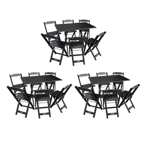 Kit 3 Conjuntos De Mesa Dobráveis De Madeira 70x110cm Com 6 Cadeiras Preta O Conjunto Dobrável é ideal para bares, restaurantes, estabelecimentos, áreas de lazer e também para sua casa. Em madeira tornando-os resistentes e duráveis, seu design permite que esse conjunto seja encaixado em qualquer ambiente, trazendo um toque a mais para seu estabelecimento. Além de sua durabilidade, o que lhe trará conforto para servir seus clientes. Por ser dobrável torna-se mais fácil guardar, manusear e limpar o produto.