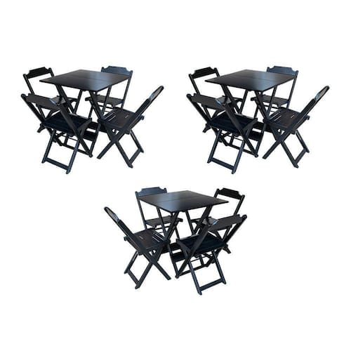 Kit 3 Conjuntos De Mesa Dobravel Com 4 Cadeiras De Madeira 70x70 Para Restaurante E Bar - PretoO produto é ideal para bares, restaurantes, estabelecimentos, áreas de lazer e também para sua casa. Feito em madeira maciça, tornando resistentes e duráveis. Seu design permite que seja encaixado em qualquer ambiente, trazendo um toque a mais para seu estabelecimento. Além de sua durabilidade, o que lhe trará conforto para servir seus clientes. Por ser dobrável torna-se mais fácil guardar, manusear e limpar o produto.Atenção: EVITE USAR PRODUTOS ABRASIVOS E QUÍMICOS PARA LIMPEZA DO PRODUTO, aconselha-se o uso de pano umedecido para melhor conservação; mantenha o produto fora de chuva e sol constantes.OBS: MDF ULTRATipo: Kit 3 Conjuntos de Mesa 4 Cadeiras Modelo: DobrávelCor: Preto Medidas Mesa:Altura: 76cmLargura: 70cmComprimento: 70cmMedidas Cadeiras:Altura: 80cmLargura: 45cmComprimento: 42cmOBS: Evite usar produtos abrasivos e químicos para limpeza do produto, aconselha-se o uso de pano umedecido para melhor conservação; mantenha o produto fora de chuva e sol constantes.ATENÇÃOIMAGENS MERAMENTE ILUSTRATIVAS REALIZADO EDIÇÃO, PODENDO HAVER UMA PEQUENA VARIAÇÃO DE COR DEPENDENDO DE CADA TELA OU MONITOR.Kit 3 Conjuntos de Mesa Dobravel com 4 Cadeiras de Madeira 70x70 para Restaurante e Bar - Preto