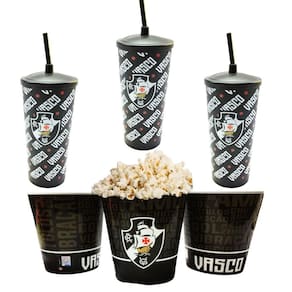 Kit 3 copos + balde de pipoca plástico preto com tampa canudo 500ml infantil criança time vasco