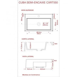 A cuba de semi-encaixe XRT550 tem seu design retangular e um excelente escoamento de água, é fabricada em mármore sintético com acabamento em gel coat, material bem semelhante a louça, muito resistente e mais econômico.. Altura do Conjunto: 11.5 cm Ambiente: null Ambiente Principal: Banheiro Cor: Branco Informação Complementar: 3x Cuba de Semi Encaixe para Banheiro xrt550 Retangular Largura: 36,5 cm Altura: 11,5 cm Peso: 8 kg