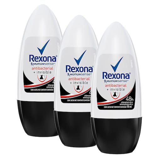 DESODORANTE ANTITRANSPIRANTE REXONA ANTIBACTERIAL + INVISIBLE ROLL-ON A exclusiva fórmula do novo Rexona Antibacerial + Invisible protege suas roupas de manchas branca e amarelas e ajuda a eliminar as bactérias que causam mau odor. 0% de álcool. 48h. Ean: 75058845