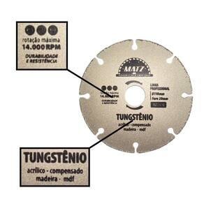 Disco de corte segmentado em tungstênio, ideal para cortes secos em madeira, MDF, compensado e acrílico. Seus segmentos de carboneto de tungstênio oferecem alta resistência ao desgaste, proporcionando cortes rápidos, precisos e com acabamento limpo. Perfeito para marcenaria, construção e projetos que exigem precisão e durabilidade em materiais diversos.
