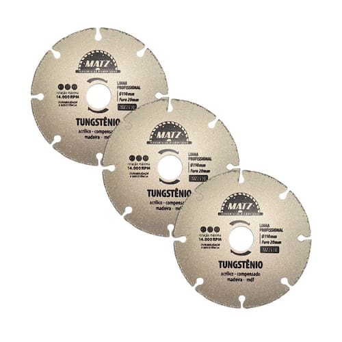 Disco de corte segmentado em tungstênio, ideal para cortes secos em madeira, MDF, compensado e acrílico. Seus segmentos de carboneto de tungstênio oferecem alta resistência ao desgaste, proporcionando cortes rápidos, precisos e com acabamento limpo. Perfeito para marcenaria, construção e projetos que exigem precisão e durabilidade em materiais diversos.