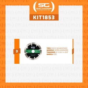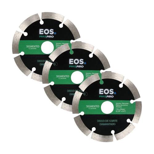 MUITO IMPORTANTE:-- CONFERIR PRODUTOS NO ATO DO RECEBIMENTO. NÃO ACEITAR PRODUTOS COM EMBALAGEM VIOLADA (AMASSADO, RASGADO, ABERTO, QUEBRADO, ETC), A RECUSA DEVE SER FEITA NO ATO.Kit 3 Discos de Serra Mármore Corte Diamantado Segmentado 110m 110x20x10 DSMS110 - EOSComponentes do kit: - 3 Discos de Serra Mármore Corte Diamantado Segmentado 110m 110x20x10 DSMS110 - EOSFicha técnica:- Modelo: DSMS110 (ESM01PRO)- Indicação: Abertura de canaletas- Dâmetro do disco: Ø 11 cm / 4-3/8"- Diâmetro do furo: Ø 2 cm- Espessura Lâmina: 1,8mm- Tipo de corte: Segmentado (Ideal para abertura de canaletas na construção civil)- RPM Máxima: 13500 RPMMedidas da embalagem: 4cm A x 16cm L x 24cm P; Peso bruto: 0,4kg.