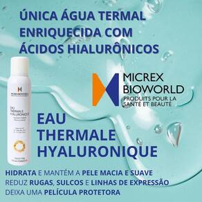 Kit 3 eau thermale hyaluronique água termal enriquecida com ácido hialurônico 150ml Kit 3 eau thermale hyaluronique micrex-bioworld O que é eau thermale hyaluronique micrex-bioworld - o spray eau thermale hyaluronique micrex-bioworld é uma água termal enriquecida com ácido hialurônico. - o spray eau thermale hyaluronique micrex-bioworld refresca, mantem a pele hidratada, suave e saudável, além de ajudar a preencher linhas finas e rugas e melhorar a elasticidade da pele. - o spray eau thermale hyaluronique micrex-bioworld é um produto inovador e exclusivo produto patenteado que contém os dois mais potentes hidratante da natureza, seja a própria água termal rica em oligoelementos e minerais , e o ácido hialurônico. Indicações: O spray eau thermale hyaluronique micrex-bioworld, indicado para todos os tipos de pele tem indicações ampliadas devido ao enriquecimento em ácido hialurônico. Água termal: - refresca, hidrata e revitaliza a pele ao longo do dia, especialmente em climas quentes ou secos e frente as múltiplas agressões externas sol, vento, polução, ar-condicionado, limpeza excessiva... , após exercícios... - sensação de pele ressecada e desidratada. Excesso de exposição ao sol. - suavizante para peles delicadas. Ajuda a acalmar a vermelhidão e a irritação. - pós barba, pós depilação, pós-tratamentos dermatológicos: como peelings químicos, laser ou microagulhamento, bem como dermatite atópica ou seborreica, ajuda a reduzir o desconforto. Ácido hialurônico: - hidrata e mantem a pele macia e suave, - reduz rugas, sulcos, linha de expressão com mais elasticidade e firmeza - deixa uma película protetora invisível permeável ao ar mantando a pele hidratada Vantagens: O spray eau thermale hyaluronique micrex-bioworld é o único produto do mercado juntando os dois mais potentes hidratantes naturais, seja o ácido hialurônico e a própria água termal . Modo de uso: - pulverizar o spray eau thermale hyaluronique micrex-bioworld com 30cm da região tratada evitando os olhos. deixar secar naturalmente sem passar mão ou pano. - pode ser antes ou depois da maquilagem. Se usar depois da maquilagem, pulverizar levemente e o spray eau thermale hyaluronique micrex-bioworld servira também de fixador de maquilagem devido a película invisível de ácido hialurônico de alto peso molecular.
