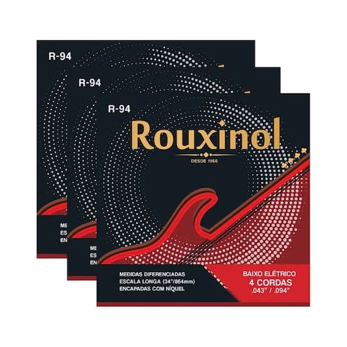 Kit 3 Encordoamentos Baixo Elétrico 4 Cordas R94 0.43" Rouxinol As cordas Rouxinol proporcionam um ótimo timbre para o seu baixo com um excelente custo-benefício, trazem a mesma qualidade presente em todos os tradicionais produtos Rouxinol / Nig.Especificações: Marca: RouxinolModelo: R94Quantidade de cordas: 4Calibres: 0.43Materiais: Encapada níquelTensão: Média