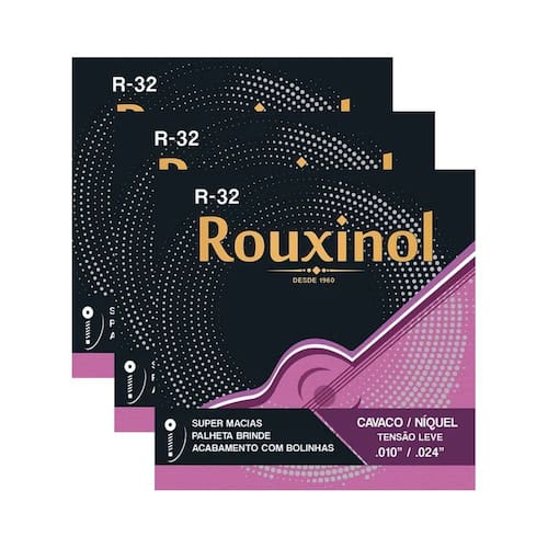 Kit 3 Encordoamento Cavaquinho Tensão Leve “0.24 R32 Rouxinol + BrindeAs cordas Rouxinol proporcionam um ótimo timbre para o seu cavaquinho com um excelente custo-benefício, trazem a mesma qualidade presente em todos os tradicionais produtos Rouxinol / Nig. O modelo R32, em especial, tem a “exclusiva ação macia”.São ótimas para vários estilos musicais brasileiros dando um bom e equilibrado timbre o seu cavaquinho.Tensão das Cordas: .010 - .012 - .018 - .024 (leve)Características:Acabamento com bolinhasPrimas: Aço inoxidável (não enferrujam).Super MaciasBordões: Alma de aço carbono estanhado, encapada com níquel.Itens Inclusos:3 Encordoamentos Cavaquinho Tensão Leve “0.24 R32 Rouxinol 3 Palhetas*Imagens Ilustrativas*
