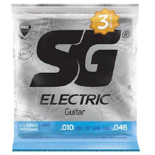 Pacote que contém três jogos de cordas SG Electric Guitar com tensão Light, resulta em uma sonoridade presente, nítida e suave. Ideal para quem busca um som com bom sustain, brilho nos médios e graves quentes. Ideal para músicos que tocam estilos musicais diversos, possibilitando a versatilidade, como por exemplo o Pop, o Jazz e o Rock. A linha níquel da SG com certeza é o que você precisa. Feita com material de primeira qualidade, as cordas de níquel apresentam a sonoridade mais equilibrada dentre os materiais utilizados para esta finalidade, alcançando desde um brilho extremo para o rock até um som mais encorpado, essencial para o jazz. Com uma gama muito grande de calibres, esta linha foi feita para trazer o máximo de conforto aos guitarristas mais exigentes. No processo de fabricação ainda existe todo um cuidado no armazenamento e manuseio dos materiais para que a durabilidade das cordas seja estendida. Medidas para uso em escala com comprimento de 25½”/ 648mm. Cordas primas em aço estanhado cilíndrico. Bordões com revestimento de aço niquelado NPS e núcleo hexagonal de aço estanhado.