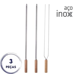 Material: Fabricado em aço inoxidável de alta qualidade, garantindo durabilidade, resistência ao calor e facilidade de limpeza. Comprimento: 85 cm, ideal para alcançar facilmente os alimentos na grelha e facilitar o manuseio durante o preparo. Design: Cabo ergonômico e resistente, projetado para proporcionar conforto e durante o uso. As pontas afiadas dos espetos facilitam a inserção dos alimentos.